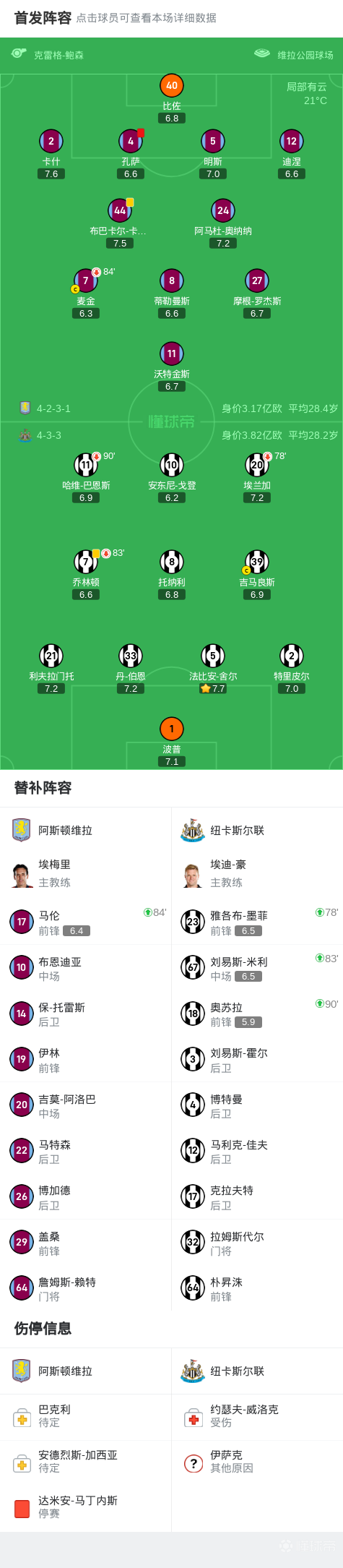 在比赛中,阿斯顿维拉的特里皮尔表现出色,一次任意球开到禁区造成对手防线的压力,球队进攻中承担了重要角色。而纽卡斯尔联的乔林顿在比赛中也展现出了一定的攻击威胁,虽然最终未能取得进球,但他的努力备受赞誉。