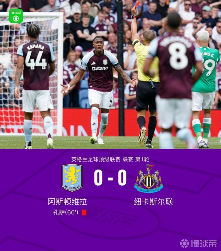阿斯顿维拉在比赛中遭遇了一次关键时刻,第66分钟,孔萨在一次危险的防守动作中对戈登犯规,被主裁判直接出示红牌罚下。这一变数让阿斯顿维拉提前一人少的情况下应对对手的攻势,比赛形势变得更加严峻。